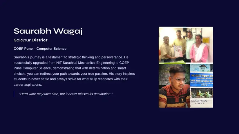 Every year, Mission Admission has the privilege of mentoring students from diverse backgrounds—rural villages, city schools, NRI families, and aspirants preparing for India’s most competitive exams. Our personalised, one-to-one counselling has helped students secure admissions in top institutes like IIT Bombay, MIT-WPU, COEP, VIT, Manipal, SRM, and many more. Whether it is guiding an OCI student through complex eligibility rules, helping a village topper reach a premier IIT, or mentoring students through CAP rounds and documentation, each success story reflects our commitment, clarity, and dedication. These selected stories highlight the hard work of our students and the trust families place in Mission Admission.